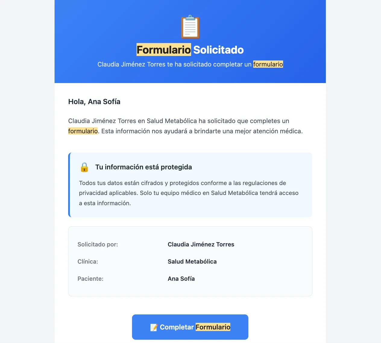 Recopila antecedentes médicos, quirúrgicos, familiares y medicamentos actuales antes de la primera cita. El paciente llega listo.
